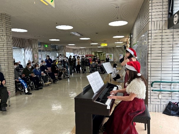 奈良県総合リハビリテーションセンターでは、外来及び入院患者さんに季節を感じていただける 取り組みとして12月19日(火)にクリスマスランチタイムコンサート、12月25日(月)には 病棟でクリスマスイベントを実施しました。 クリスマスランチタイムコンサートは、ピアニストの大杉惠子さんとリハビリテーション科秋田言語聴覚士 (フルート)によるロビーでのコンサートです。12時10分から30分間で7曲のクリスマスソングの 演奏があり、外来患者さん、病棟患者さん、職員が鈴や手拍子でリズムをとったり、また、「赤鼻のトナカイ」 「きよしこのよる」の2曲は参加者で一緒に口ずさみ、最後はアンコールとなる和やかなコンサートとなりました。 病棟では、サンタクロースに扮した医師と看護師がベットサイドに出向きました。ささやかなプレザントを お渡しして記念の写真撮影を行いました。普段と異なるスタッフの姿に患者さんからは自然と笑みが こぼれていました。後日、記念写真は患者さんにプレゼントし病棟でも掲示いたしました。 どちらの催しも参加者から「クリスマスの雰囲気を味わえた」や「入院していてもクリスマスを楽しめた」 などのお声があり好評に終えました。 |